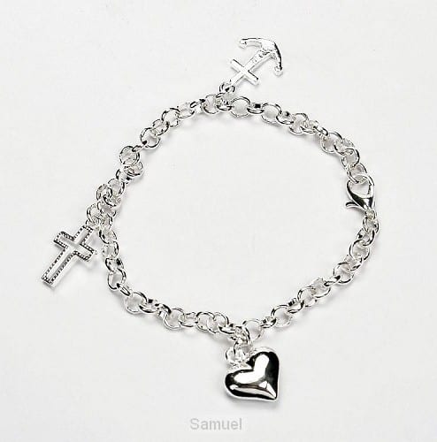 Mooi zilverkleurig armband(je) met drie hangers anker, hart en kruis als teken voor ‘geloof, hoop en liefde’