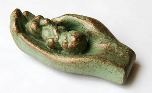 Mooi beeldje van brons (10cm), baby in hand. Symbolisch dat God ons in zijn Handen draagt.