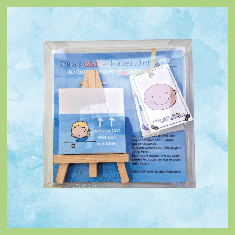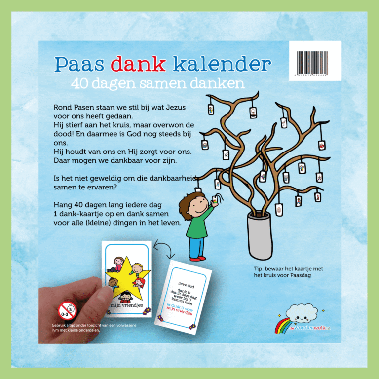 De dankkalender van De Wonderwolk bestaat uit veertig kaartjes. Op de kaartjes staan herkenbare afbeeldingen uit het dagelijks leven waarvoor gedankt kan worden. Door elke dag als gezin of schoolklas een kaartje te bespreken en voor de kleine en grote dingen in het leven te danken, beleef je met elkaar al dankend de veertigdagentijd. Een mooie manier om toe te leven naar Pasen!