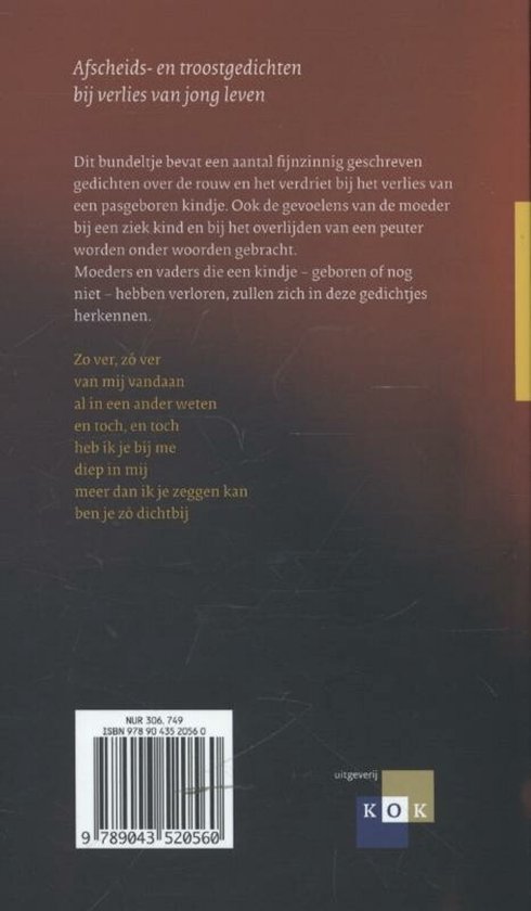 Dit bundeltje bevat een aantal fijnzinnig geschreven gedichten over de rouw en het verdriet bij het verlies van een pasgeboren kindje. Ook de gevoelens van de moeder bij een ziek kind en bij het overlijden van een peuter worden onder woorden gebracht. Moeders en vaders die een kindje – geboren of nog niet – hebben verloren, zullen zich in deze gedichtjes herkennen.