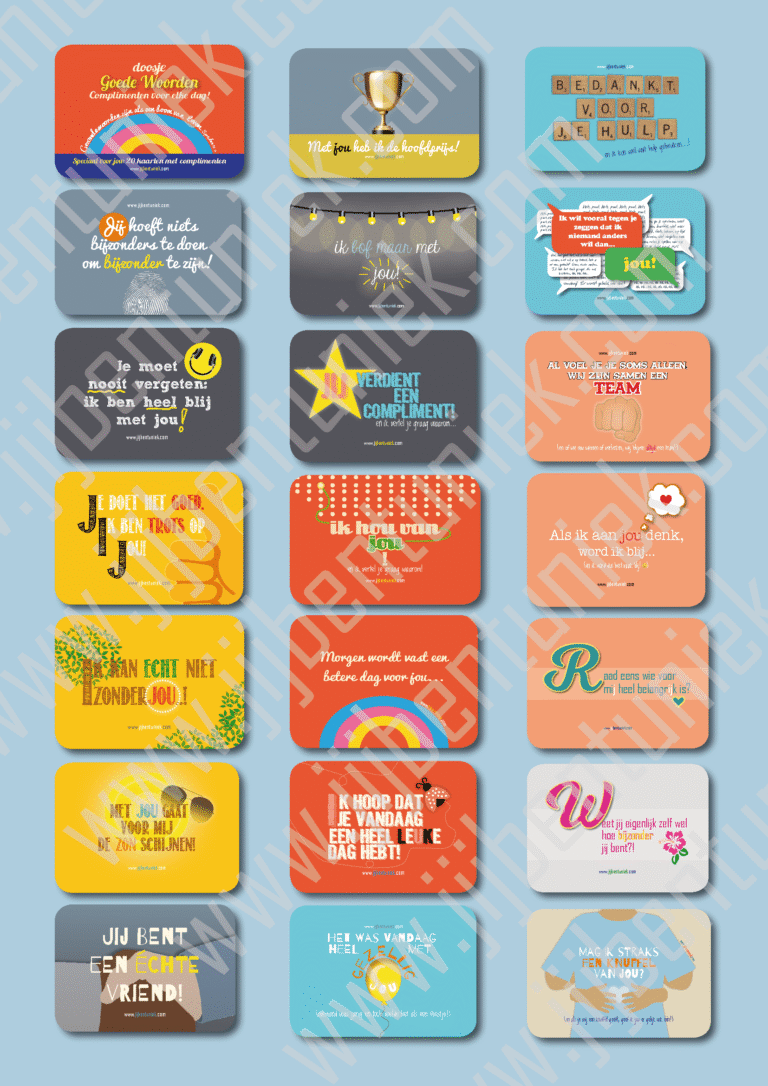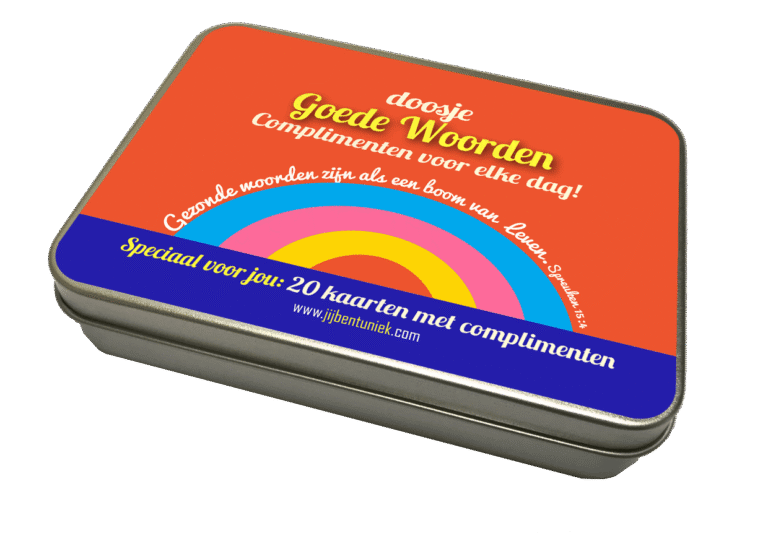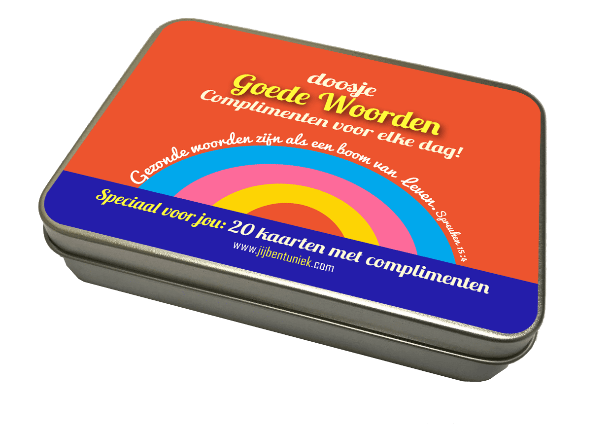 20 kaartjes met complimenten! Het metalen doosje bevat 20 kaartjes van stevig karton met daarop een leuk, lief of mooi compliment in de ‘jij-vorm’. De doosjes passen door de brievenbus (10,9 x 8,0 x 2,45 cm) en de kaarten zijn achterop beschrijfbaar. (exclusief kaarthouder)