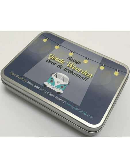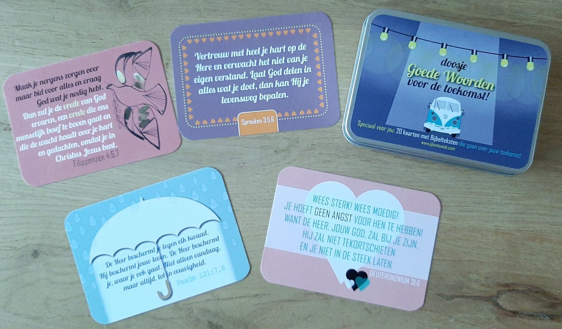 In deze coronatijd kampen veel mensen met onzekerheid, onrust en wellicht angstige gedachten over de toekomst. Het is dan goed je te richten op Gods gedachten over de toekomst! In dit aluminimum doosje zitten 20 kaartjes van stevig karton met daarop een Bijbeltekst over Gods plannen en ideeën over de toekomst. Ook een aanrader om vormelingen en tieners te bemoedigen!