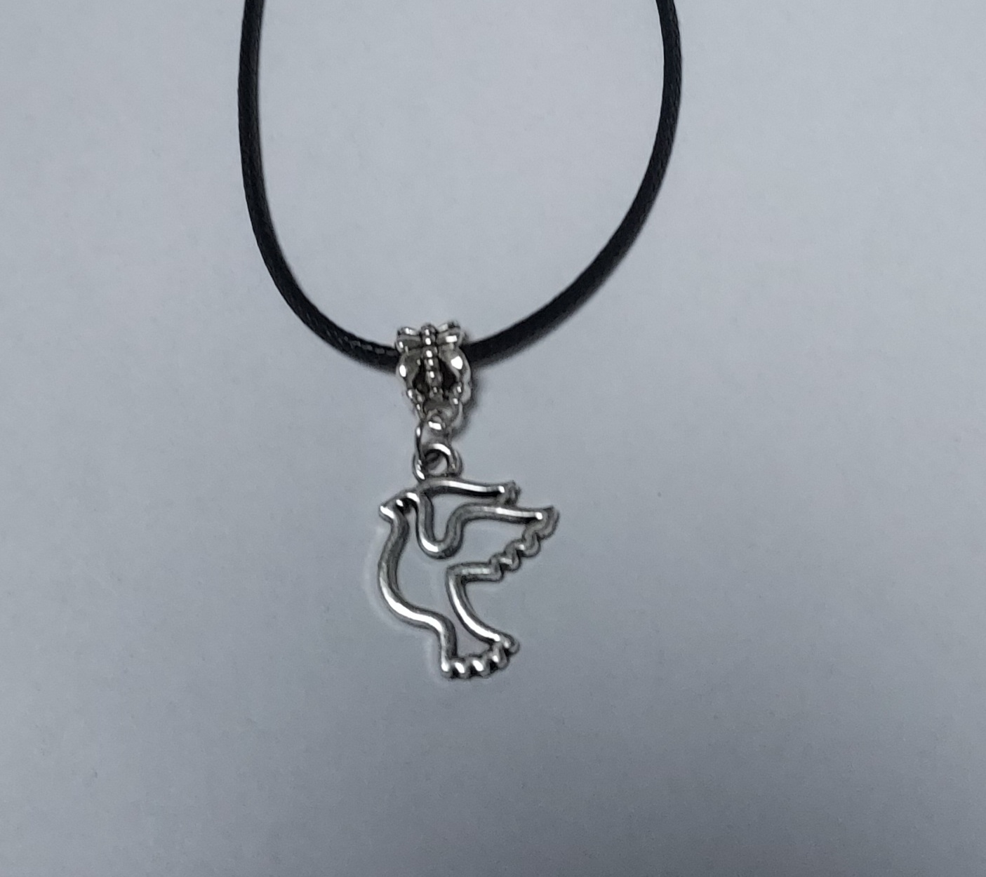 Een mooi zilverkleurig bedeltje van een duif (H. Geest) aan een zwart koord.