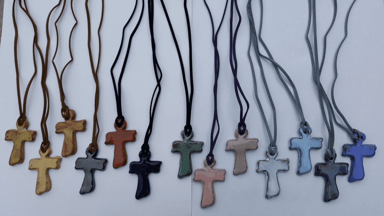 Kruisje met koord (keramiek, handgemaakt en gebakken)