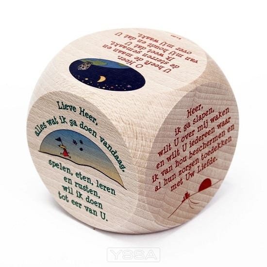 Kindergebeden met kleuren-illustraties. Mooi om thuis te gebruiken en ieder kind om de beurt te laten ’dobbelen’en voorbidden. De teksten die erop staan zijn:…(let op extra porto omdat het niet door de brievenbus past)