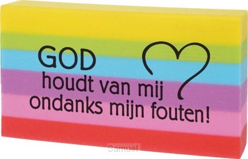 een mooi gekleurde gum, gummetje, met de tekst ‘God houdt van mij ondanks mijn fouten’