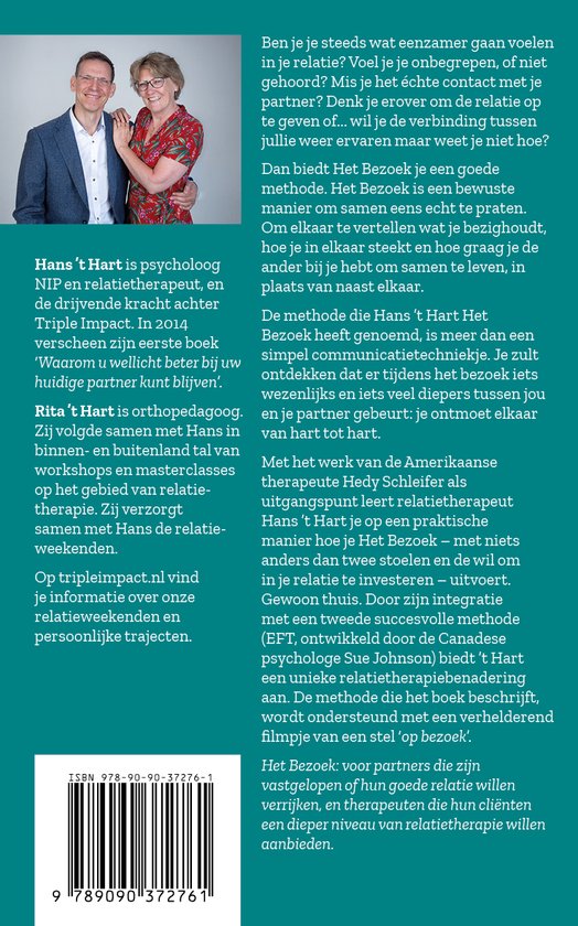 Met het werk van de Amerikaanse therapeute Hedy Schleifer als uitgangs punt leert relatietherapeut Hans ’t Hart je op een praktische manier hoe je Het Bezoek – met niets anders dan twee stoelen en de wil om in je relatie te investeren – uitvoert. Gewoon thuis. Door zijn integratie met een tweede succesvolle methode (EFT, ontwikkeld door de Canadese psychologe Sue Johnson) biedt ’t Hart een unieke relatietherapiebenadering aan. De methode die het boek beschrijft, wordt ondersteund met een verhelderend filmpje van een stel ‘op bezoek’.