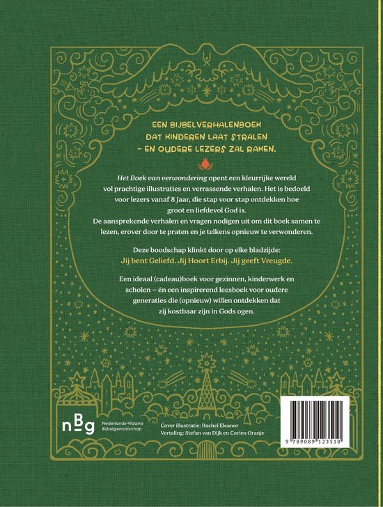 Een Bijbelverhalenboek dat kinderen laat stralen – en oudere lezers zal raken. Het boek van verwondering opent een kleurrijke wereld vol prachtige illustraties en verrassend vertelde Bijbelverhalen. Deze bijzondere verhalenboek is bedoeld voor lezers vanaf 8 jaar, die stap voor stap ontdekken hoe groot en liefdevol God is. De met zorg geschreven teksten en kleurrijke illustraties brengen bekende én minder bekende Bijbelverhalen tot leven en laten zien: iedereen hoort erbij. De aansprekende verhalen en vragen nodigen uit om deze kinderbijbel samen te lezen, erover door te praten en je telkens opnieuw te verwonderen. Deze boodschap klinkt door op elke bladzijde: Jij bent Geliefd. Jij Hoort Erbij. Jij geeft Vreugde. Dit maakt Het boek van verwondering tot een ideaal (cadeau)boek voor gezinnen, kinderwerk en scholen én een inspirerend leesboek voor ouders, grootouders en andere volwassenen die (opnieuw) willen ontdekken dat zij kostbaar zijn in Gods ogen.