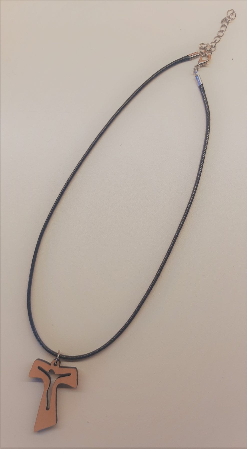 Erg mooi houten kruisje met Jezus (ongeveer 3 x 4 cm groot) aan een zwart koord met een verstelbaar zilveren sluiting.