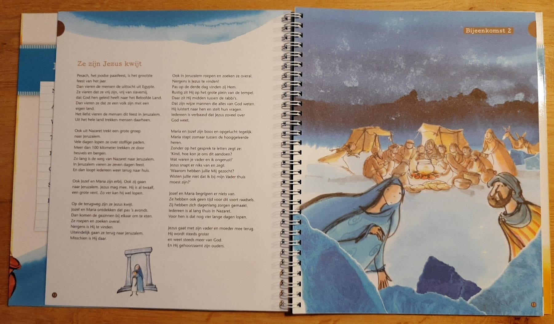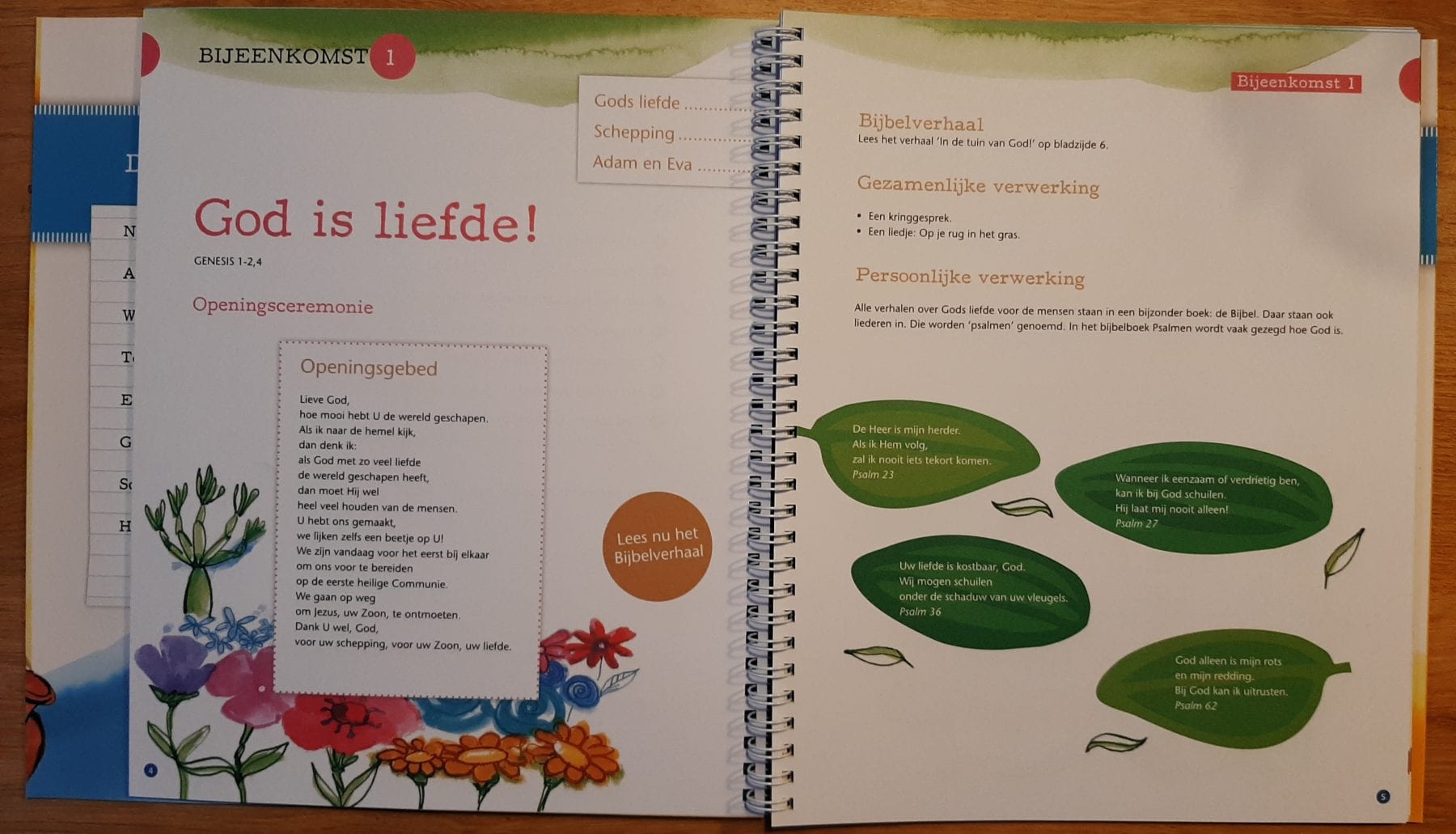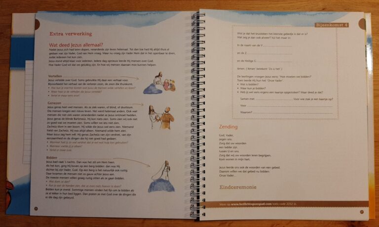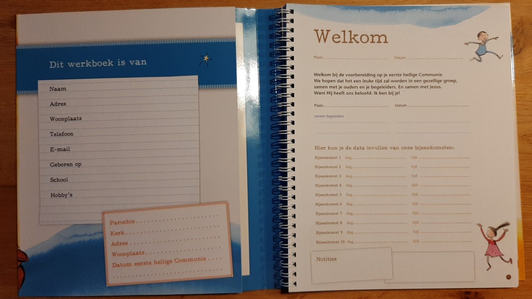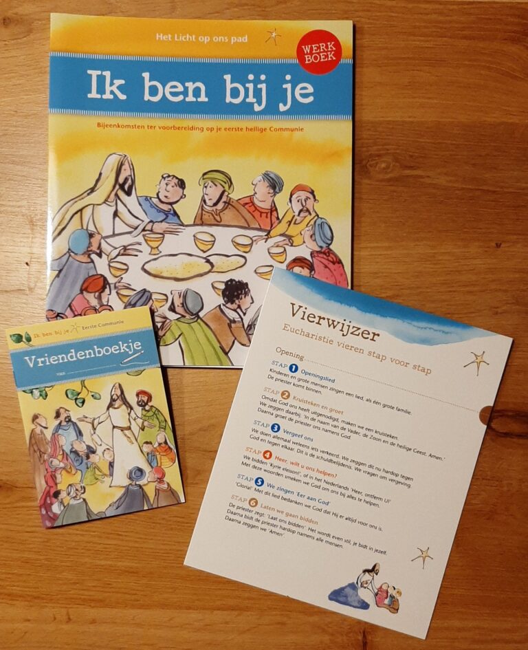 Op weg naar je eerste heilige Communie leer je veel over Jezus, zijn woorden, zijn leven, zijn dood en verrijzenis. Je leert waarom je op Jezus kunt vertrouwen. ‘Ik ben bij je’, heeft hij ons beloofd. En je ontdekt waarom het fijn is om bij Hem te horen in de Communie. (10 bijeenkomsten: 8 voor en 2 na de eerste heilige Communie). Een vrolijk geïllustreerd werkboek met verborgen ringband. Mét als extra voor de communicant: een vriendenboekje, een vierwijzer (legt stap voor stap de eucharistie uit) en invulkaartjes! Voor de begeleiders is er een apart begeleidersboek.