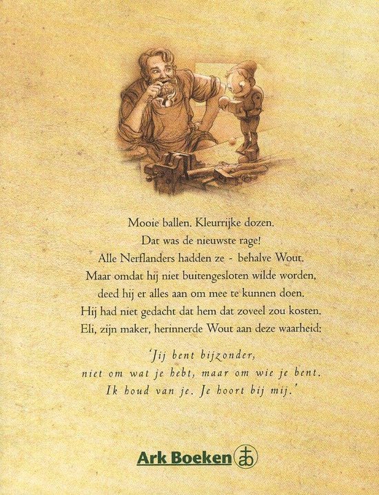 De kleine houten Wout uit “Niemand is zoals jij”, leert in dit verhaal een belangrijke levensles. Bij de Nerflanders ontbrandt de strijd wie de meeste mooie ballen en kleurrijke dozen kan verzamelen. Iedereen is in de ban van hebzucht en zelfverrijking. Ook Wout doet aan de rage mee en verkoopt alles om dozen en ballen te kunnen kopen. Totdat hij met zijn hele handel op stap gaat en bij de grote houtsnijder Eli binnenvalt. Die doet Wout beseffen dat de verzamelde glitter niet de norm is, maar dat hij als persoon geaccepteerd wordt door Eli.