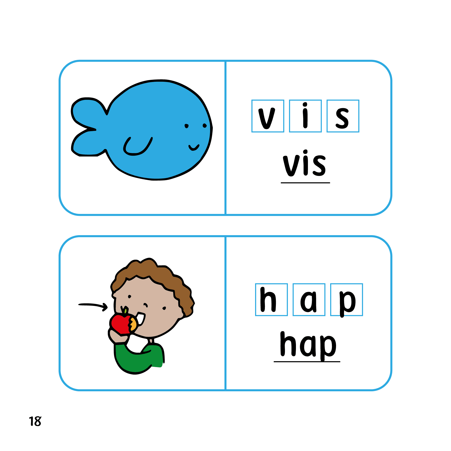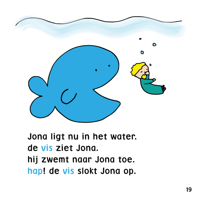 De rechterpagina’s zijn voorleespagina’s. Op deze voorleespagina’s vind je telkens de woorden van de linker pagina terug in het blauw.