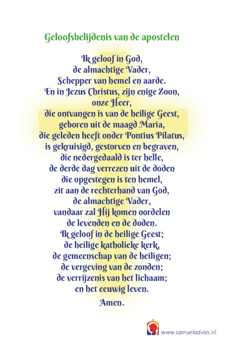 Mooi uitgevoerde gelamineerde stevige kaart met de 12 artikelen van het geloof die we iedere zondag samen in de kerk bidden.