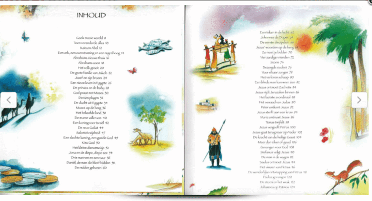 Naast de bekende verhalen worden ook verhalen over Petrus en Paulus verteld en sluit deze kinderbijbel af met het verhaal van Johannes op Patmos. Per verhaal een verwijzing naar de bijbehorende bijbelhoofdstukken.