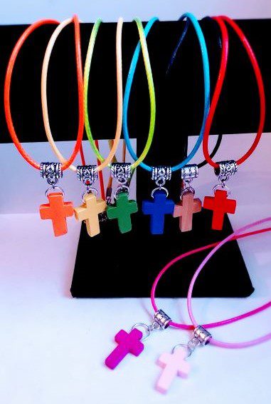 Een effen gekleurd kruisje (2,5 x 2 cm) aan een gekleurd koord.