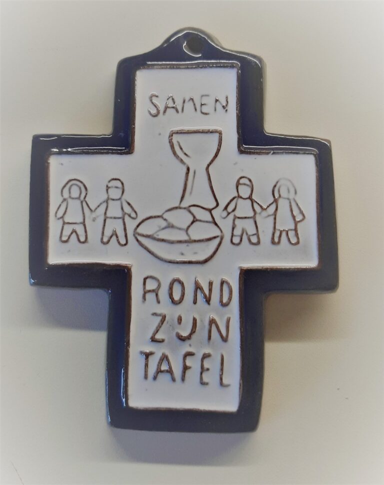Keramieken kruisje van circa 12×9 cm om op te hangen. Blanco met blauwe rand met tekst: SAMEN ROND ZIJN TAFEL