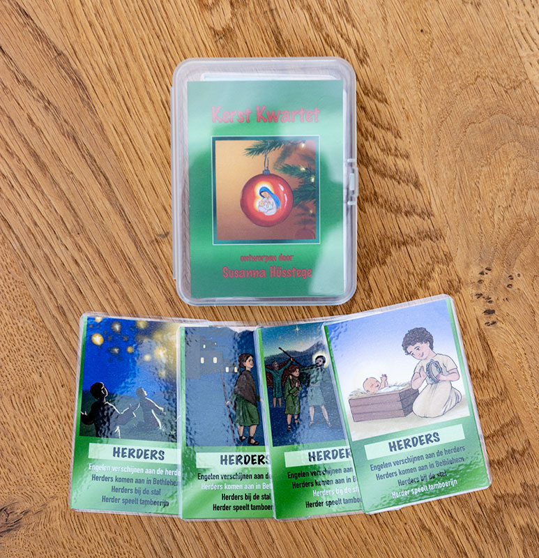 Prachtig geïllustreerd en vormgegeven kwartetspel door Susanna Hüsstege. Op speelse wijze leren kinderen het Kerstverhaal kennen door de afbeeldingen en teksten op de speelkaarten.