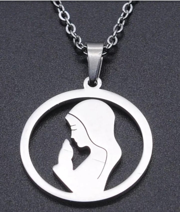 Een zilverkleurige Maria hanger aan zilverkleurige 50 cm lange ketting.