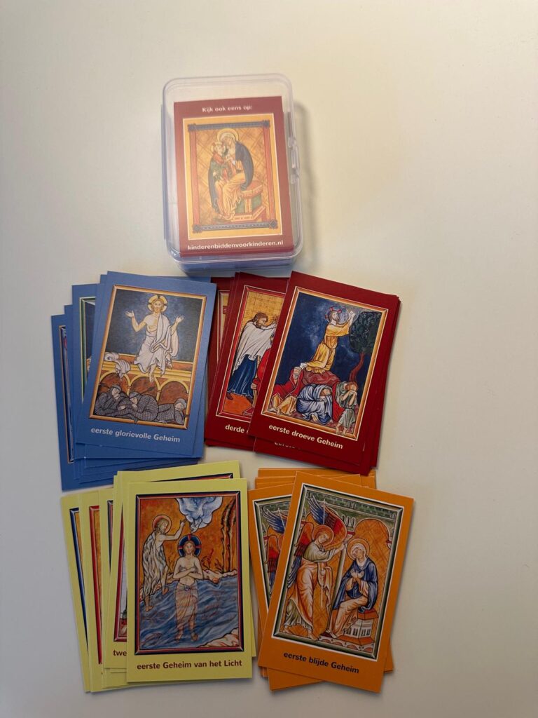 Een leuk memoriespel met afbeeldingen van alle 20 geheimen van de rozenkrans. De afbeeldingen komen uit het rozenkransboekje voor kinderen (BL3043).