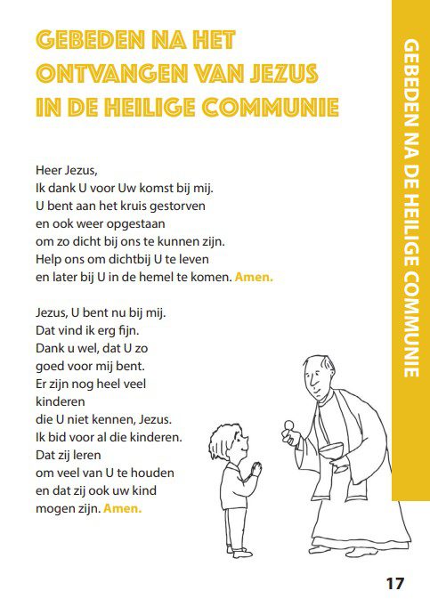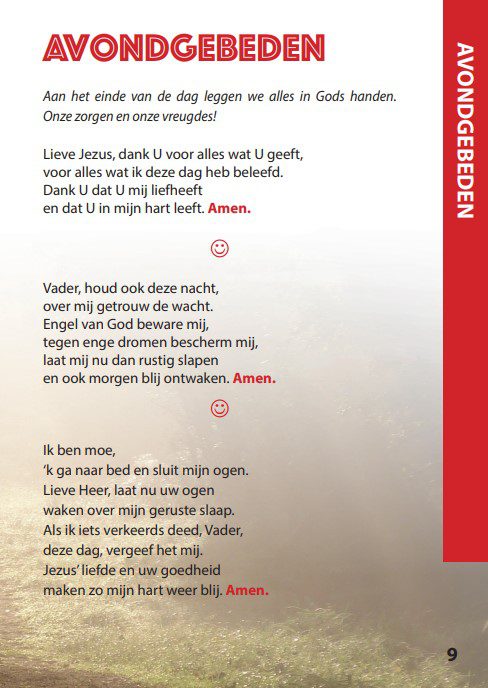 Een gebedenboekje waarin ook de rijkdom uit onze katholieke traditie is opgenomen. Er staan gebeden in voor kinderen van 5-12 jaar, in verschillende lengtes en moeilijkheidsgraad. Gebedjes voor aan tafel, morgen- en avondgebeden, gebedjes voor verschillende feesten, gebed na de H. Communie…