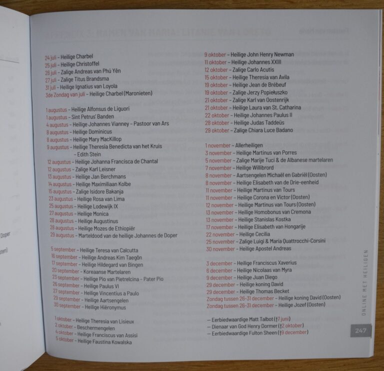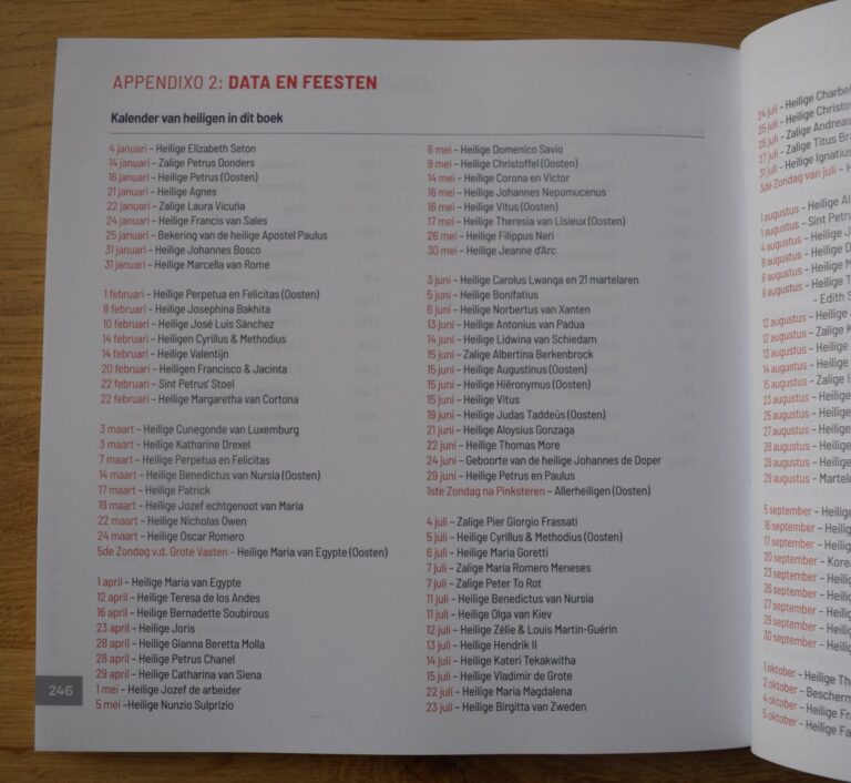 Achterin het boek vind je ook; een kalender van de heiligen die in het boek besproken worden (data en feesten), overzicht van de feesten van Maria, de namen van Maria (Litanie van Loreto), een korte handleiding voor het houden van een lectio divina, register van heiligen en een register van de onderwerpen besproken in het boek. Bij dit boek hoort een app die je kunt downloaden.
