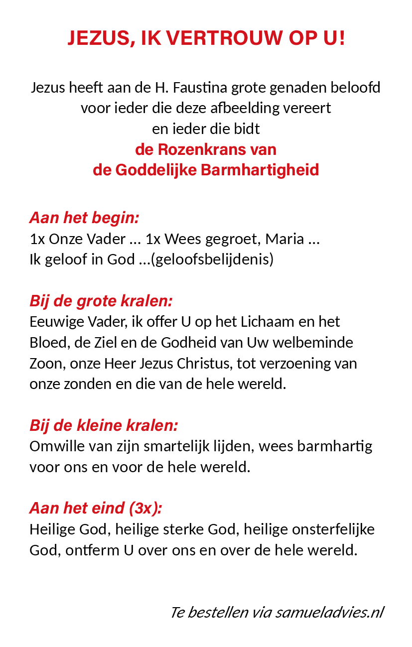 Een mooi gelamineerd prentje om altijd bij je te dragen met de afbeelding zoals Jezus zich als de Barmhartige Jezus heeft laten zien aan de H. Zuster Faustina.