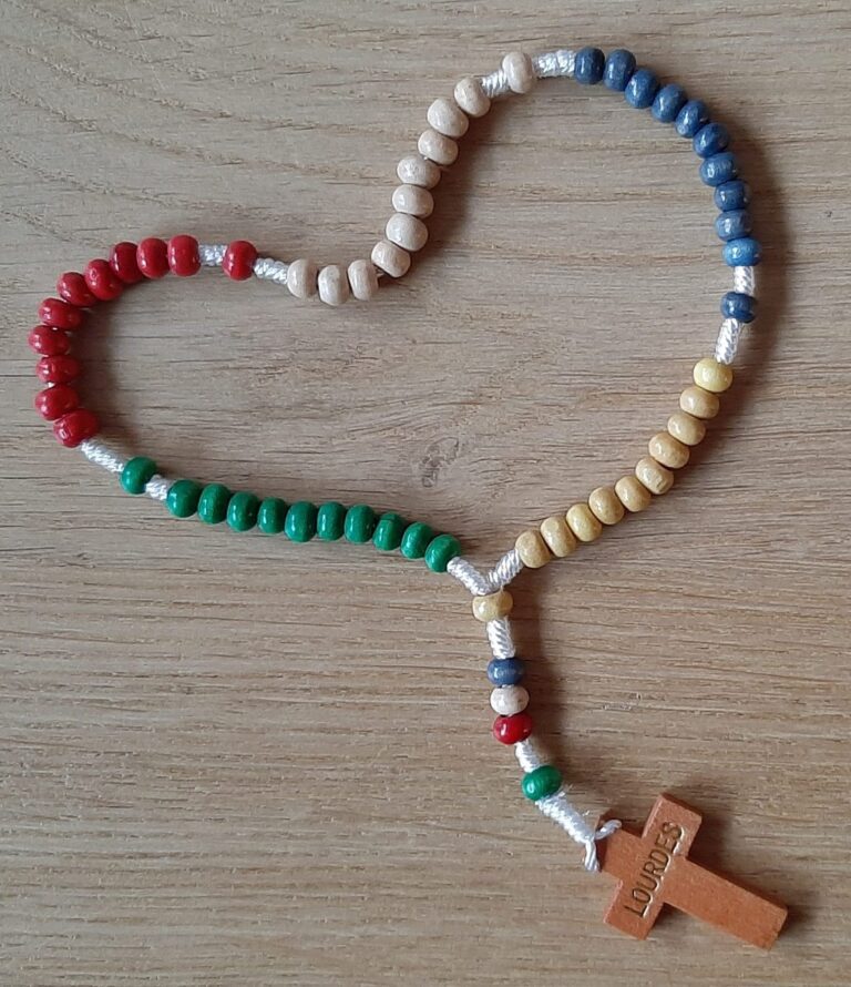 Houten rozenkrans uit Lourdes. Elk tientje heeft een andere kleur kralen.