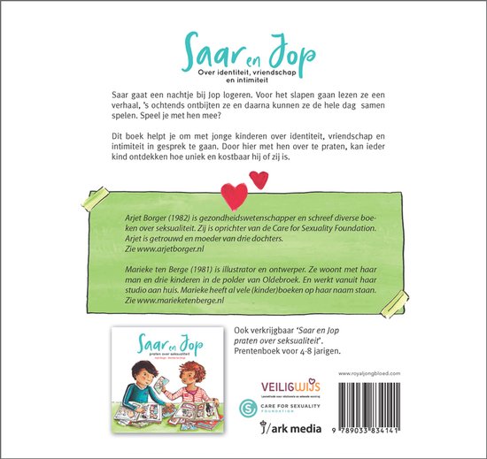 Het kan soms best lastig zijn om met jonge kinderen over seksualiteit en intimiteit te praten. Het prentenboek Saar en Jop over identiteit, vriendschap en intimiteit helpt ouders om met kinderen van 2-6 jaar te praten. Het boek is heel geschikt om te gebruiken in het gezin, op het kinderdagverblijf, op school en op de peuterspeelzaal. Het prentenboek vertelt het herkenbare verhaal van twee jonge kinderen die bij elkaar gaan logeren. Met aansluitend gespreksvragen voor twee leeftijdscategorieën: 3-4 jaar en 5-6 jaar. Arjet Borger (1982) is gezondheidswetenschapper en schreef diverse boeken over seksualiteit. Zij is directeur van Zorg voor Seksualiteit. Arjet is getrouwd en moeder van vier dochters. De illustraties van Marieke ten Berge (1981) sluiten perfect aan bij de belevingswereld van (jonge) kinderen. Marieke illustreerde onder andere de Peuterbijbel.