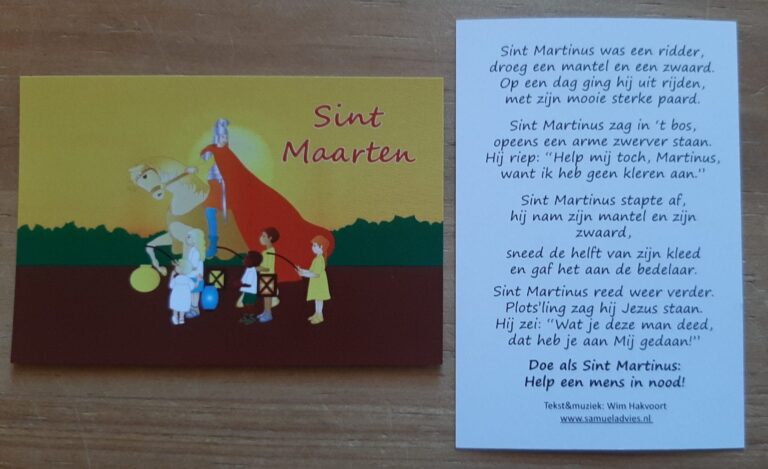 Fris uitdeelkaartje met afbeelding van Sint Maarten die zijn mantel deelt en achterop de tekst van het liedje over Sint Maarten.