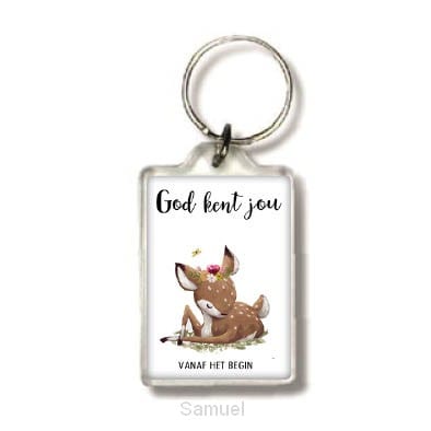 Sleutelhanger: God kent jou vanaf het begin met een hertje. Past leuk bij het bekende kinderliedje God kent jou!