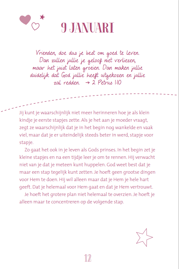 Dit bijbels dagboek biedt een dagelijks moment van rust vinden bij God aan jonge meiden die opgroeien in en drukke wereld en helpt hen bij het leren luisteren naar zijn stem. Voor elke dag van het jaar een bijbeltekst met een bemoedigende of inspirerende overdenking.