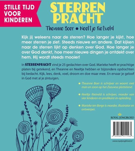 In Sterrenpracht vind je 25 gedachten over God. Marieke heeft er prachtige platen bij getekend, en Theanne en Neeltje hebben er bijzondere opdrachten bij bedacht. Kijk, lees, denk, voel, droom en doe maar mee. En ervaar je geloof in God met al je zintuigen.