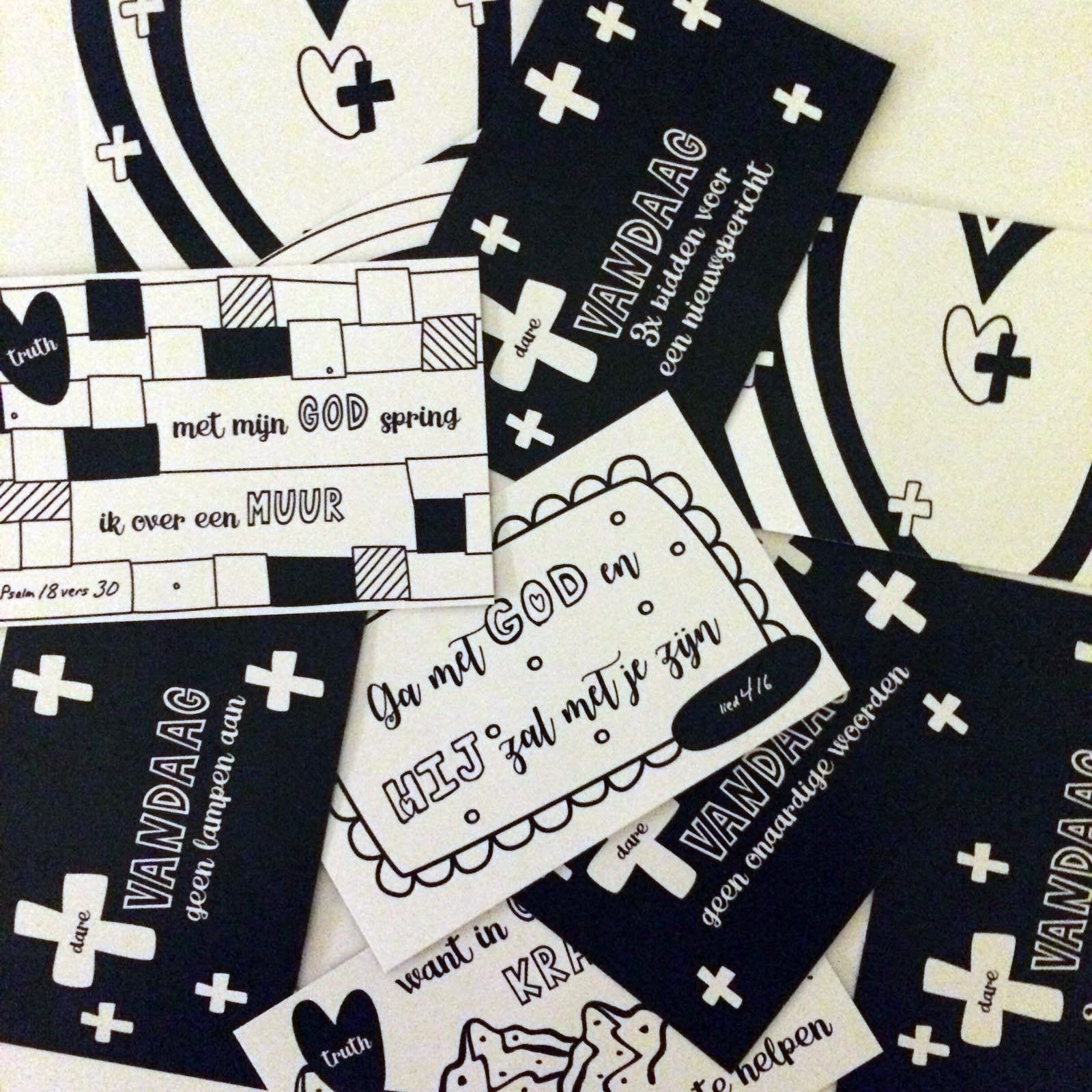 Op de 20 Truth kaartjes staat een bemoedigende tekst, op de 20 Dare kaartjes een uitdaging tot vasten. Durf jij het aan?