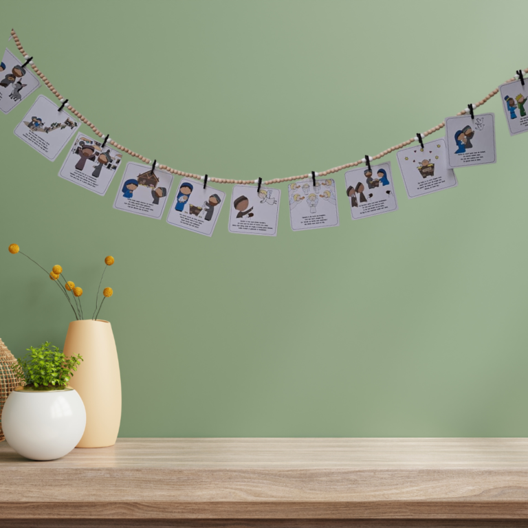 Speciaal voor de adventstijd is deze leuke slinger ontwikkeld. Hang samen met je kind elke dag een nieuw kaartje aan deze decoratieve slinger. Een leuke manier om samen het kerstverhaal te beleven.