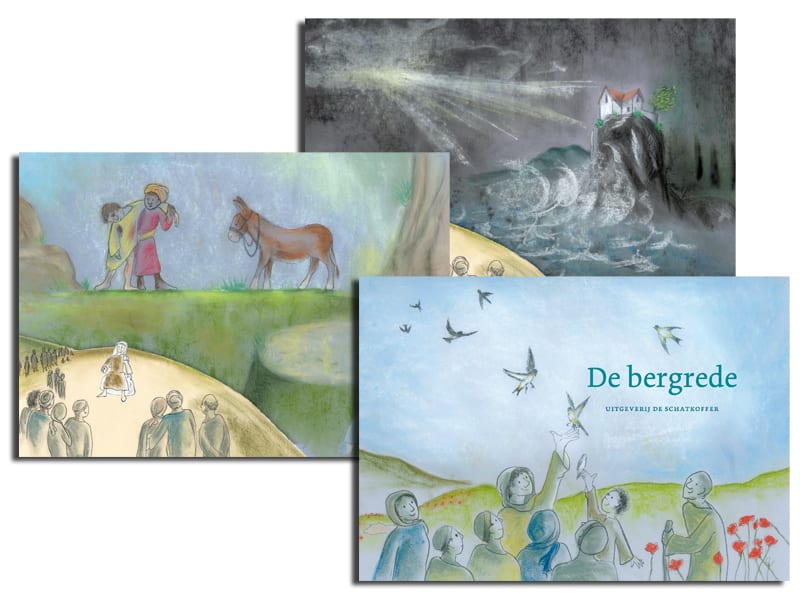 De bergrede van De Schatkoffer wordt door middel van een raamvertelling in beeld gebracht. Bij sommige fragmenten uit Jezus’ rede hebben we gezocht naar bijbelverhalen die zijn woorden illustreren. Bijvoorbeeld: wanneer Jezus zegt ‘Zalig de armen van geest’, hebben we gedacht aan de vrouw die Jezus’ voeten zalft met kostbare olie (Lucas 7:36-50); zíj was iemand die erkende dat ze volledig afhankelijk was van God. Dankzij deze raamvertelvorm is De bergrede voor kinderen heel toegankelijk gemaakt.