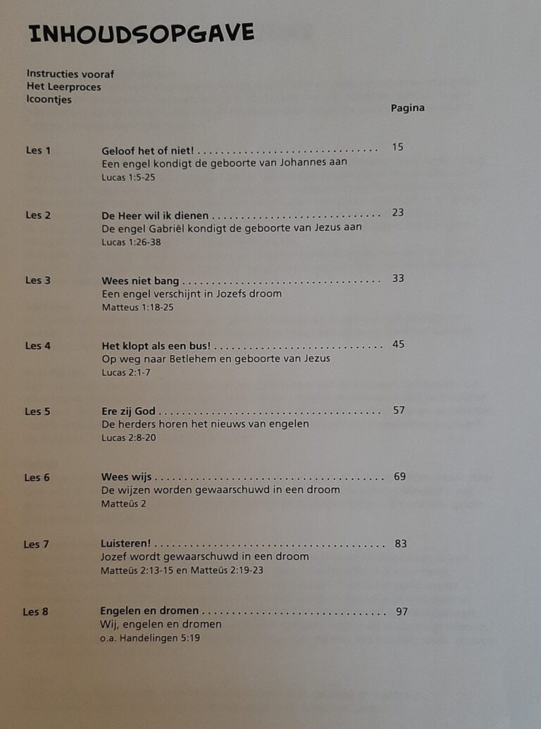 Leeftijd: 4-7 jaar. In de lessen in dit kerstboek laten we zien hoe God engelen en dromen gebruikt rond de geboorte van de Here Jezus. Verhalen vanaf de aankondiging van de geboorte van Johannes tot en met Jozef die wordt gewaarschuwd dat hij naar Egypte moet vluchten met Jezus en Maria.