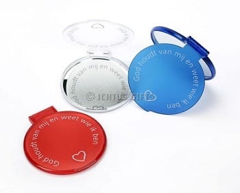 Leuk gekleurd zakspiegeltje met bemoedigende tekst: God houdt van mij en weet wie ik ben.