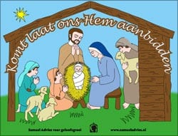 ...de kerststal etc. Laat eventueel de tekst Komt laat ons Hem aanbidden inkleuren met zilveren of gouden pen. Klik op het plaatje voor een PDF die zich eenvoudig laat printen....