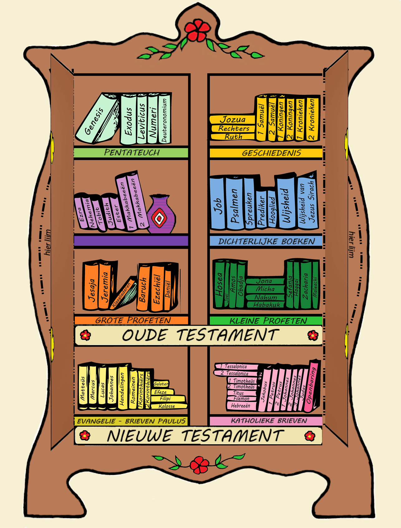 Werkje waarbij de verschillende Bijbelboeken een plekje krijgen in de boekenkast.