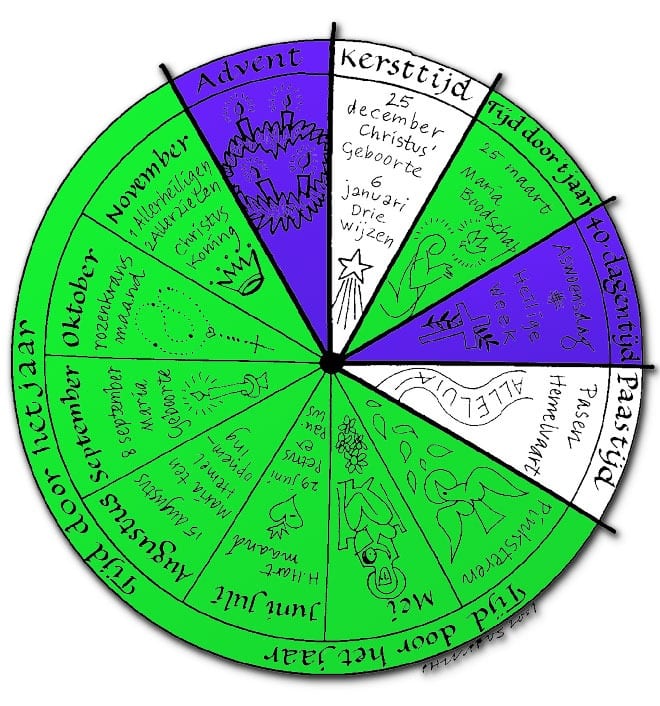 Van de indeling van het kerkelijk jaar – Advent / Kersttijd / Veertigdagentijd / Paastijd / tijd door het jaar – is een mooie tekening gemaakt die ook als werkje kan worden gebruikt.