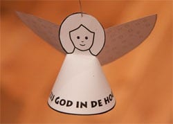 Hangertje engel: hier kun je er meerdere van maken om thuis (de kerk) en de kerstboom mee te versieren! Versier de vleugeltjes met een glitterstift, uitknippen en in elkaar zetten! Snel werkje met vrolijk resultaat!