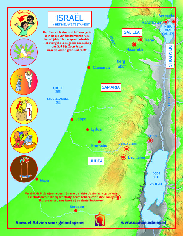 Jezus liep hele grote afstanden om aan de mensen over Gods liefde te vertellen. Kijk maar op deze kaart waar Hij allemaal geweest is! Download ingekleurde kaart