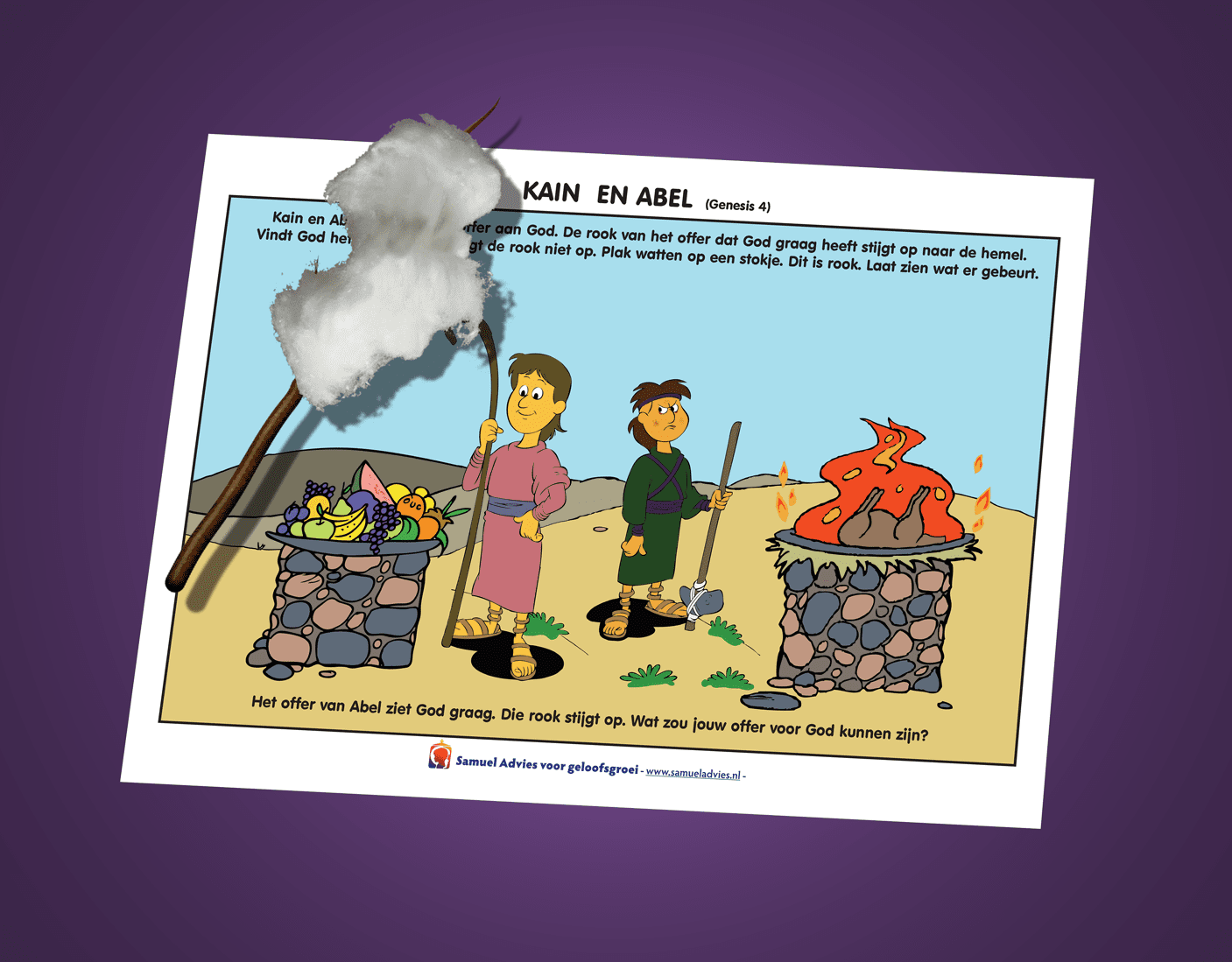 Werkje bij het verhaal van Kaïn en Abel over het offer dat God graag ziet van de mensen, met de vraag aan het kind; “Wat zou jij als offer kunnen geven om God te eren?
