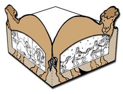 Kameel-lantaarntje. Een lantaarntje waar je een waxine lichtje in kunt zetten in de vorm van een kameel met afbeeldingen van het verhaal van de wijzen die op bezoek gaan bij Jezus.
