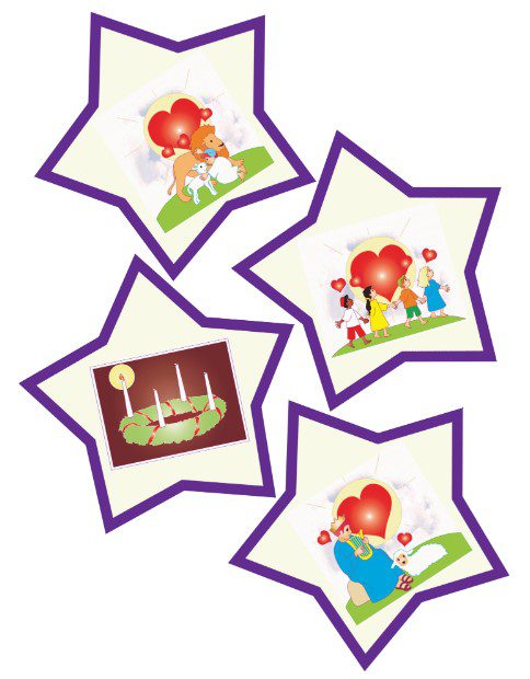 Kerststerren met de afbeeldingen uit het “Dagboekje voor de Advent” (te koop in de webwinkel)