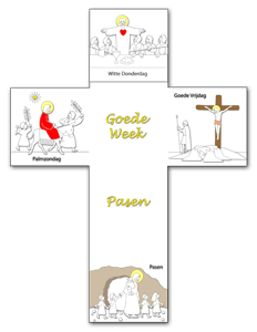 Knutselwerkje van het Kruis voor de verwerking van de Goede Week. Bij iedere belangrijke dag van de Goede week is er een klein uitlegtekstje wat je kunt vouwen en erbij bevestigen.