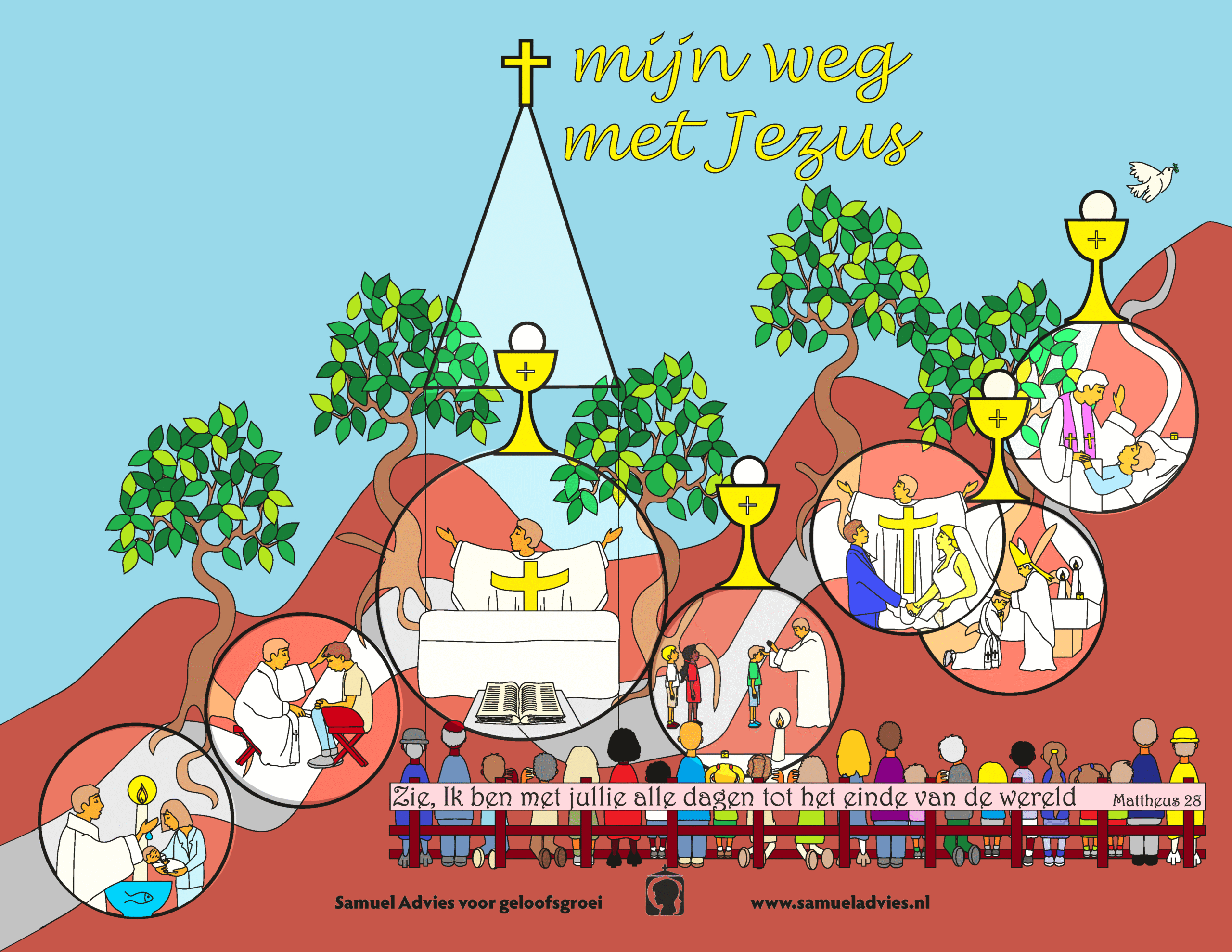 Mooie kleurplaat die alle sacramenten op de levenslooplijn plaatst om zo te laten zien wat ieders weg met Jezus kan zijn.