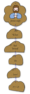 Een leuke mobile van 5 broden met daarop de tekst: Jezus zegt: