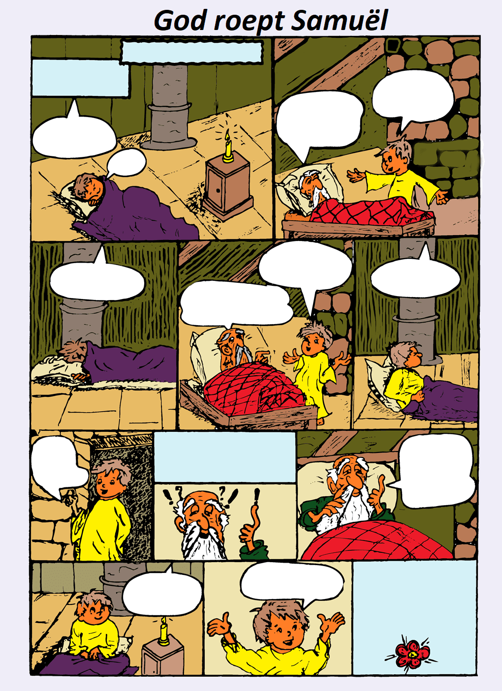 Een mooie strip over Samuël. Hij wordt geroepen door God. Lees I Samuel 3 en voeg de tekst toe.