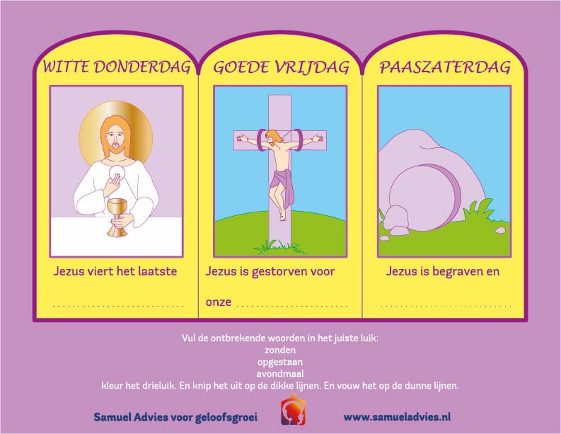 Mooi werkje om duidelijk te maken wat we vieren op Witte Donderdag, Goede Vrijdag en Paaszaterdag.